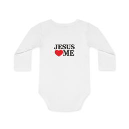 Soft, breathable organic cotton cuddles for little ones who already carry big faith. This long-sleeve bodysuit pairs clean, classic lettering with a simple red heart—front and back—so your baby can wear a gentle reminder of love whether napping, playing, or worshipping in your arms. The medium-weight knit keeps tiny shoulders cozy through cool mornings and…